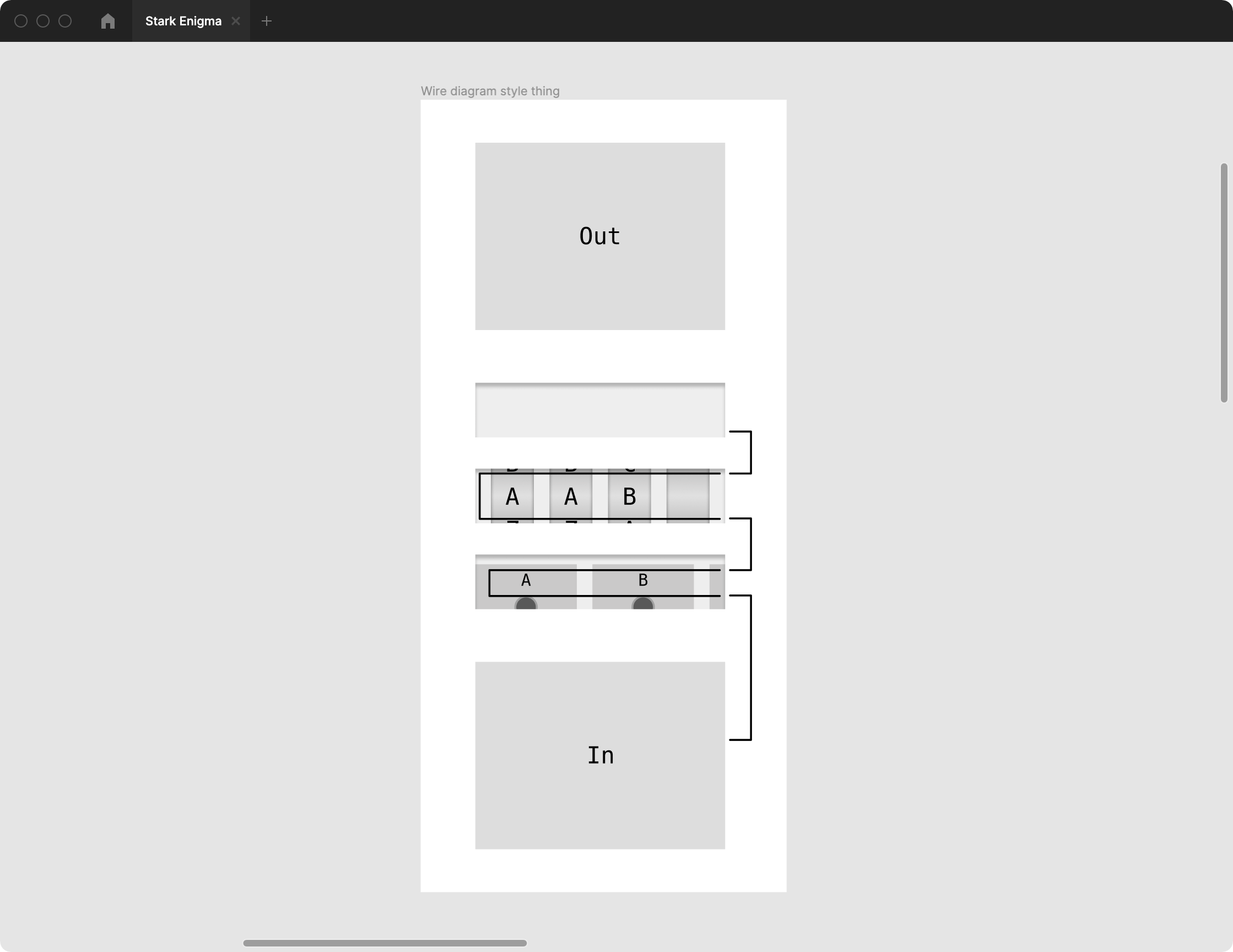 At this point, I put a pin in the plugboard problem for later because I remembered there’s more to an Enigma machine than the plugs. Behold, the very first concept in which I attempted to lay out the machine on a scrolling 2D plane: