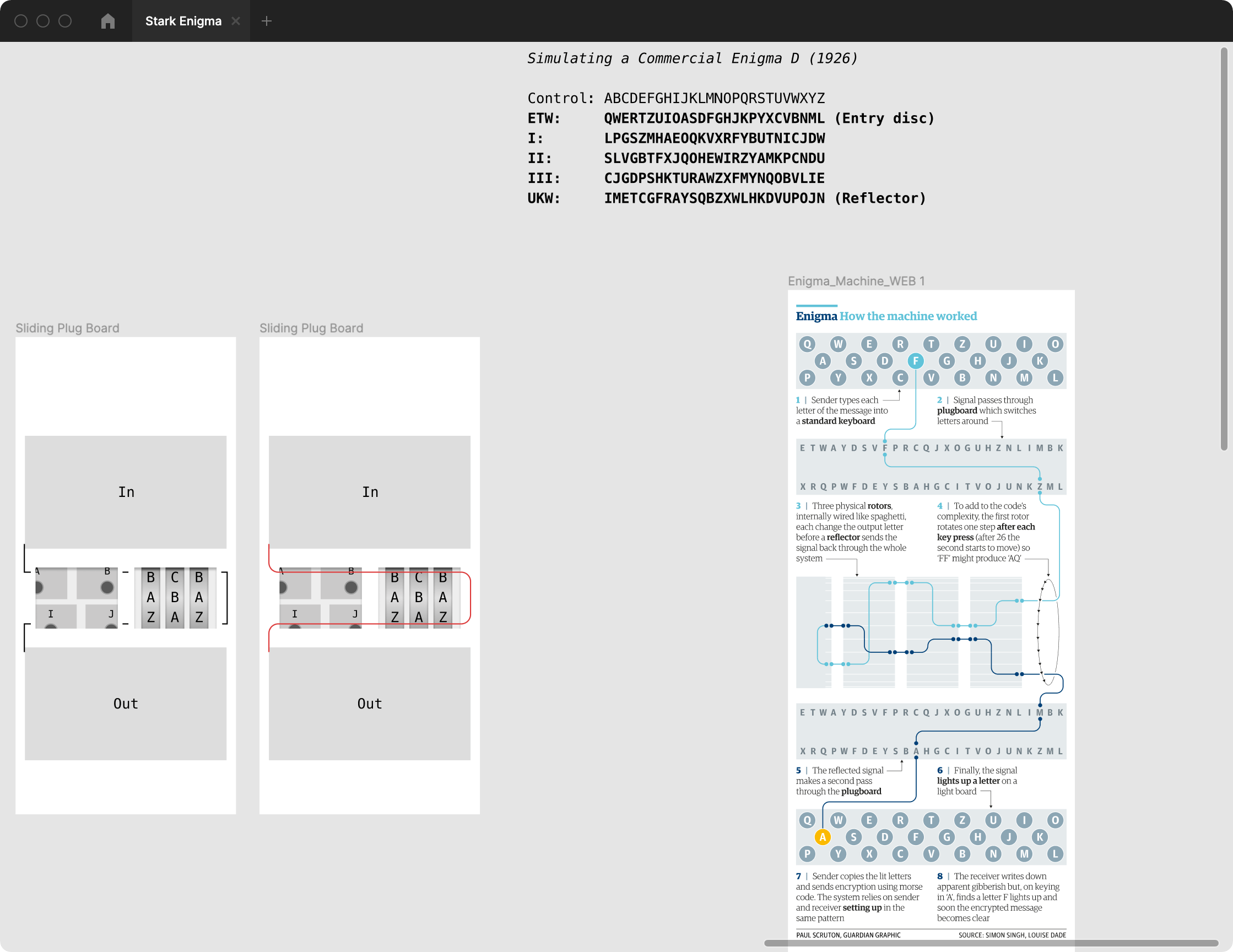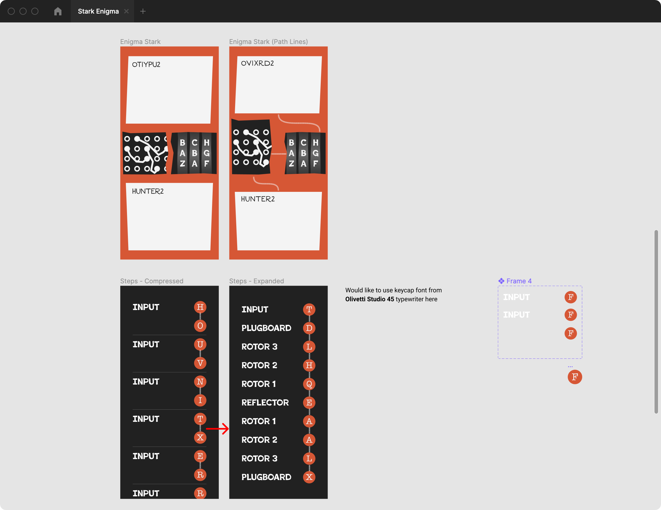 After refining the wiring even more to just a single track with no loopbacks, I felt like it was in a good place. For good measure, I added an additional view of the different steps the message went through to get the encoded output. As an aside, information on typewriter keycap fonts are surprisingly sparse. Tons of blogs dedicated to the actual monospaced typefaces in various 20th century typewriters but almost nothing about the keycap fonts. The steps would act like a subway map, each letter could be expanded for the “stops” it took on its journey through the machine.